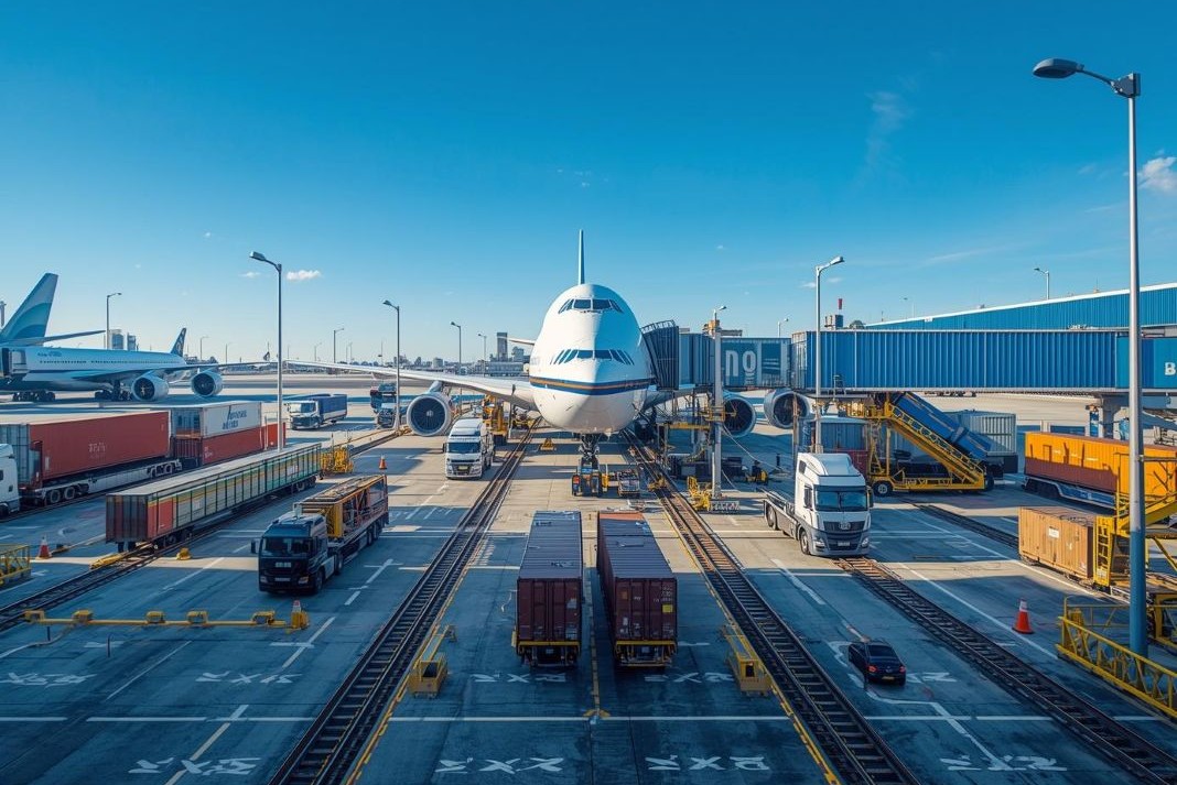 HomeA dynamic scene depicting the bustling activity of air freight logistics within a Special Economic Zone, featuring cargo planes, road and rail 3]