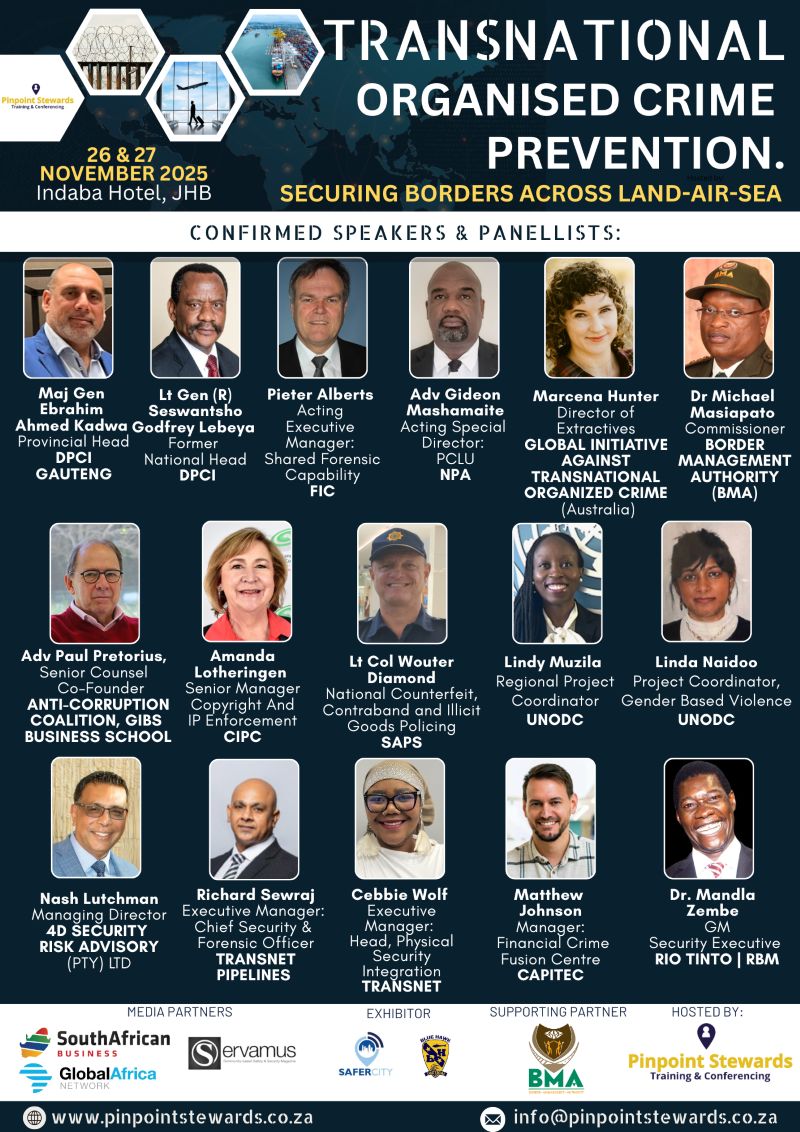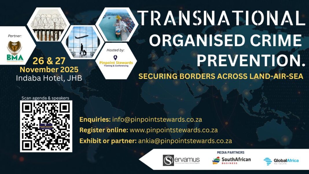 Local- and multinational businesses will collaborate with key enforcement entities and authorities in an effort to secure borders across land-air-sea. The two-day Transnational Organised Crime (TOC) conference will take place at the Indaba Hotel, JHB from 26-27 November 2025, organised by Pinpoint Stewards who recently hosted the annual Mine Security conference in June.