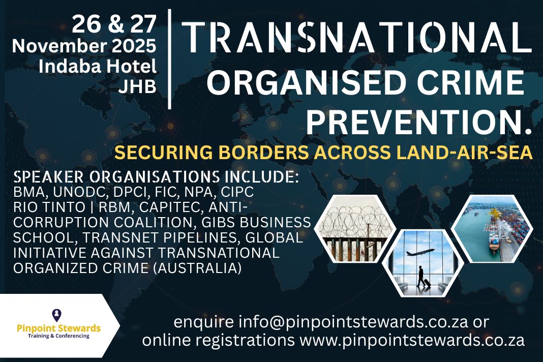 Pinpoint Stewards, a South African business, have invited some of the key stakeholders and organisations facing this mammoth geographical task to address Transnational Organised Crime Prevention during a two day conference on 26 and 27 November at the Indaba Hotel, Johannesburg.