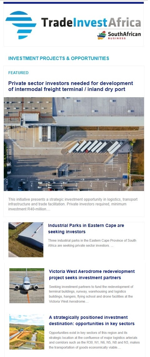 Sign up for TradeInvestAfrica, an email newsletter containing current business, trade and investment opportunities in Africa. Or sign up for South African Business, an email newsletter focused on business and investment news from South Africa.